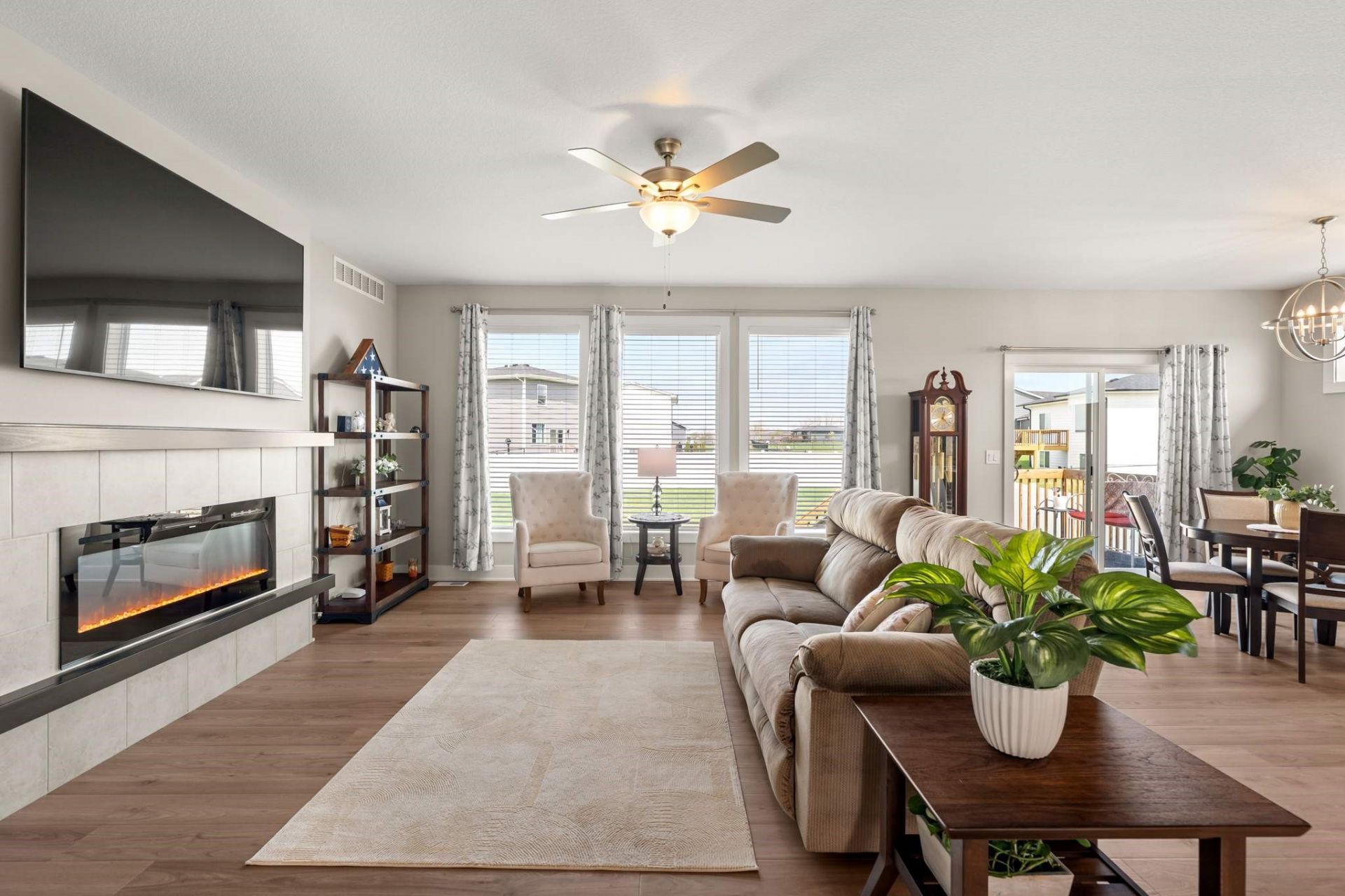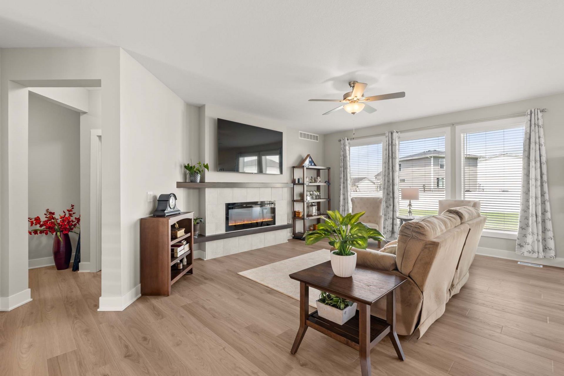 Like new, but better! No wait, added expense, or unfinished details. This raised ranch offers a large, flat backyard fully enclosed with a white vinyl privacy fence. Step inside through the double door entry to a light-filled, open-concept layout featuring a spacious great room with a triple bank of oversized windows, 9' ceilings, and a sleek linear electric fireplace. Natural light continues with transom windows in the dining area and primary suite. The kitchen features white cabinets, quartz countertops, a large island, and pantry. The private primary suite includes dual vanities, a tile shower, and a walk-in closet, with secondary bedrooms on the opposite side, creating a true owner's retreat. Additional highlights include a drop zone with bench, pass-through laundry to the primary closet, finished lower level with family room, bedroom, bath, and plenty of storage. Located near bike trails and Barrett Boesen Park with its NatureScape Playground.