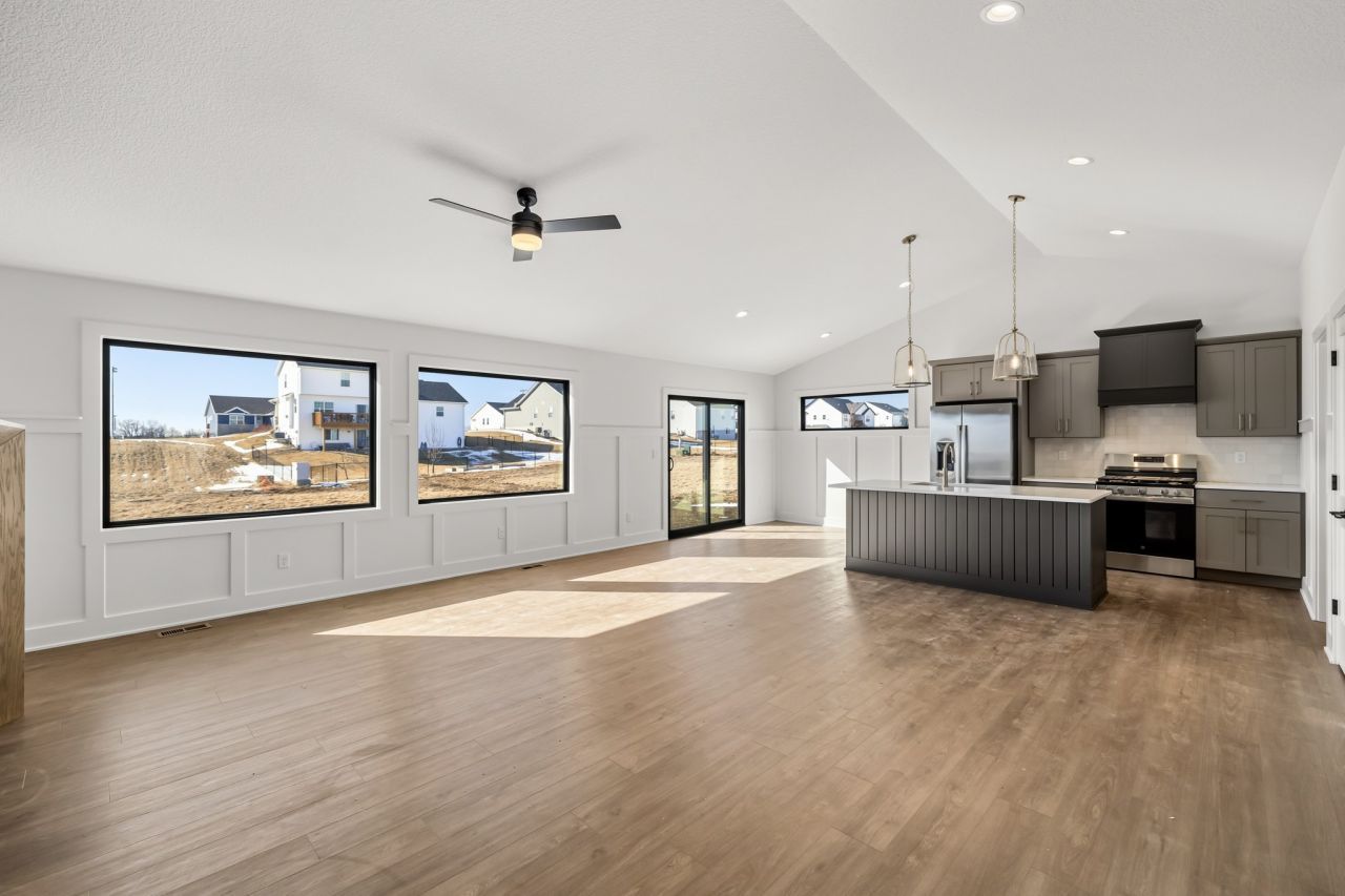 Home is complete! Beautiful new construction ranch in Stuart's newest subdivision offering over 2,300 square feet of finished living space and situated on a just under half acre corner lot. The open concept main level features vaulted ceilings, luxury vinyl plank flooring, and a stunning kitchen with quartz countertops, tile backsplash, custom hood, upgraded sink, stainless appliances, and a large island with statement pendant lighting. The spacious primary suite includes a tiled shower and comfort height finishes, while the finished walkout lower level adds two additional bedrooms, a full bath, generous family room, and wet bar perfect for entertaining. Enjoy the convenience of main level laundry, a three-car garage with 8-foot doors, and a rear concrete patio ideal for relaxing or hosting. Built with energy efficiency in mind including high efficiency HVAC and quality insulation, this home offers modern style, functional space, and small town living with room to spread out. All information obtained from seller and public records.