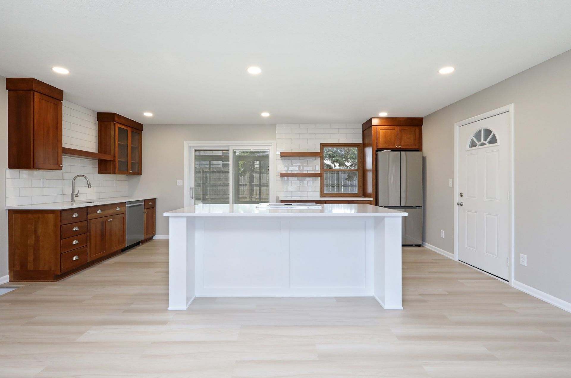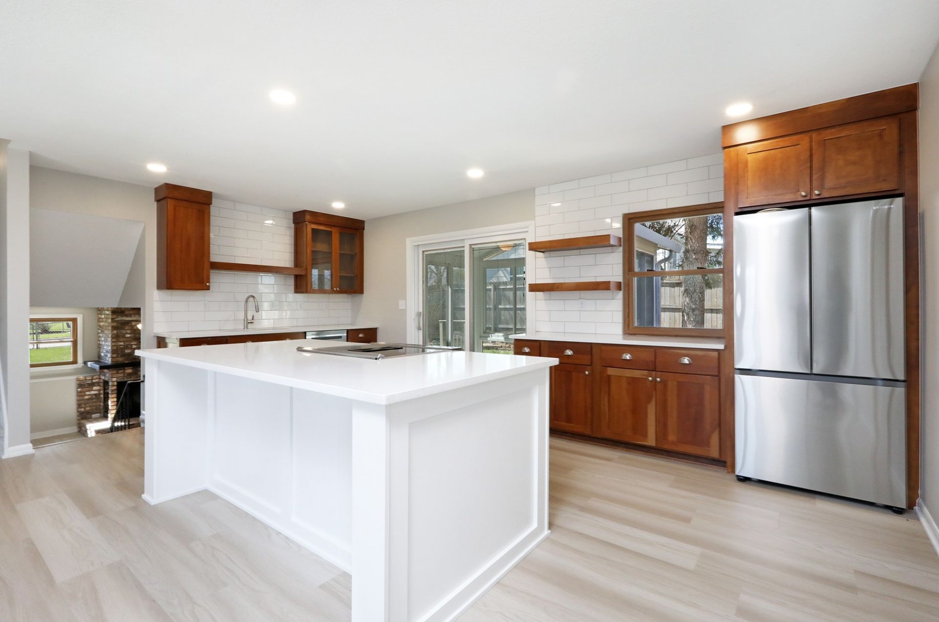 Updated split-level home in Urbandale with open living, flexible space, and mid-century design elements. Main level features new flooring and an updated kitchen with quartz countertops, subway tile backsplash, and center island. A 4-season room off the kitchen offers surrounding windows and access to the deck and fenced backyard. Upper level includes bedrooms and a full bath. Lower-level family room features a brick fireplace and half bath. Basement includes additional finished space with a 3/4 bath and flexible use. Garage includes epoxy flooring, utility sink, built-in cabinetry, and workspace. Additional storage includes built-in shelving and drawer systems. Exterior features include updated siding accents, patio, storage shed, and fenced yard. Location near parks, schools, shopping, and metro access.